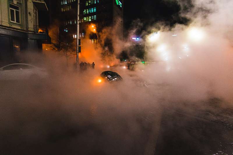 Во вторник, 13 ноября, в центре Киева прорвало трубы горячего водоснабжения. В результате улицу Шота Руставели залило кипятком. От горячей воды в воздух поднялся пар — ним затянуло почти весь район.