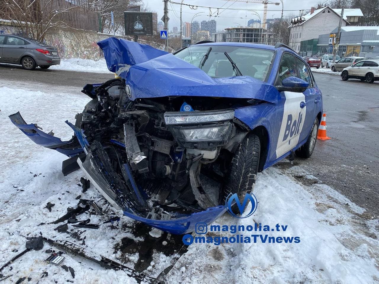 Таксист компании Bolt рассказал, что двигался в правой полосе движения в направлении Соломенской, когда встречный автомобиль начал разворачиваться. Из-за потока машин водитель Skoda не сразу заметил манёвр, поэтому ему пришлось резко выворачивать руль вправо, из-за чего он влетел в столб.